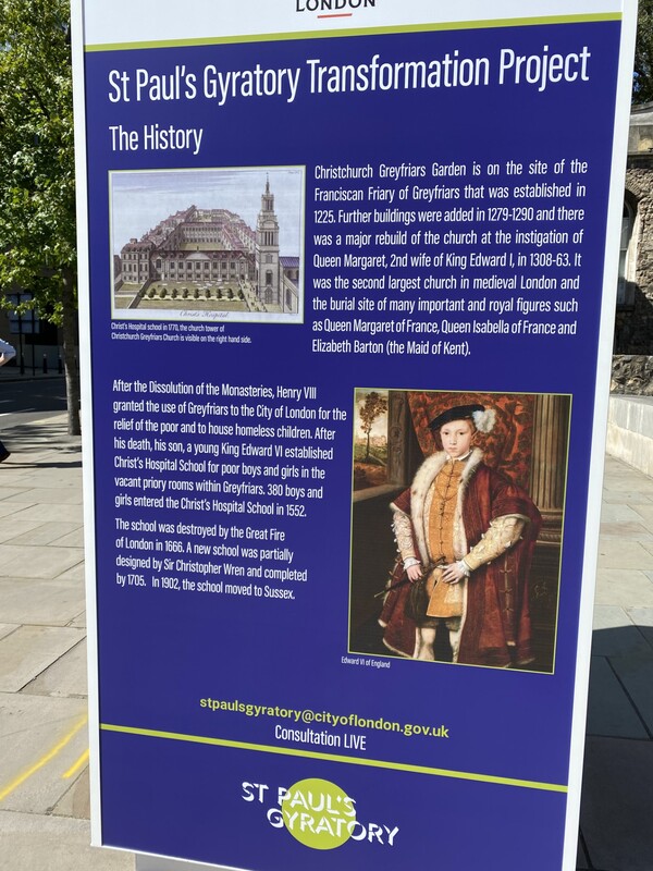 There has been a plethora of consultations over the summer from the City Corporation and others. All of them are trying to plan for a better environment or healthier living. I hope you can help and respond or just read and see what is possibly planned. A wonderful idea is to change the road system around St Martin’s Le Grand and Little Britain in what is called the St Paul’s Gyratory System. See the ideas for a new public space that will complement the existing Greyfriars Gardens and the route to St Paul’s Cathedral. Nearby there is a review of the gardens around Barber-Surgeons’ Hall and I visited them again so that I could be up to date in replying to the questions. https://news.cityoflondon.gov.uk/have-your-say-on-improvements-to-barber-surgeons-gardens/